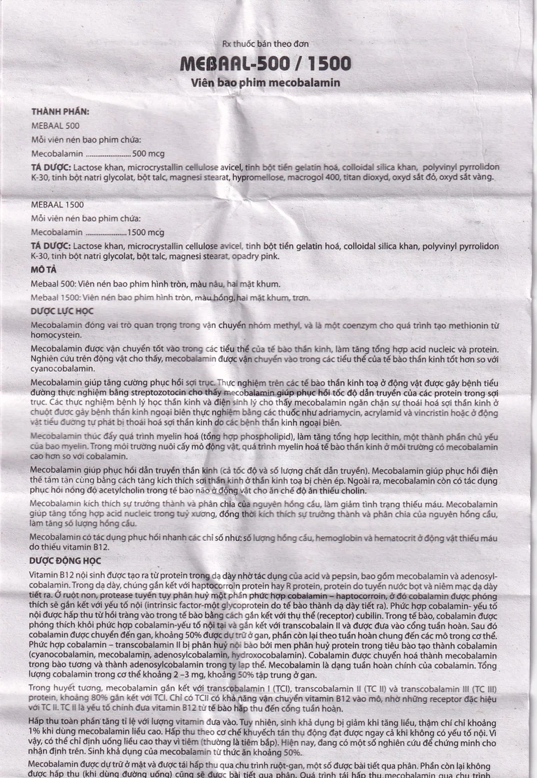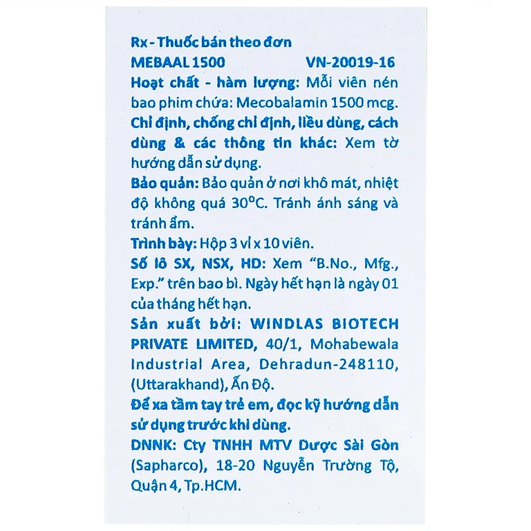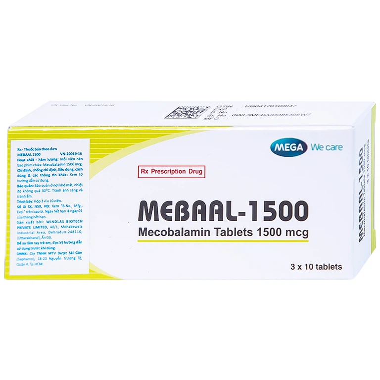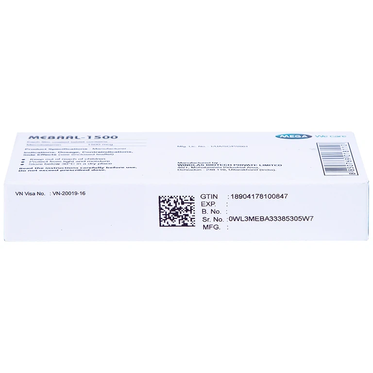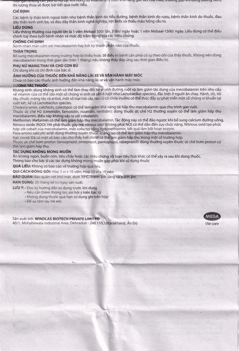 Thuốc Mebaal 1500 Mega 3 x 10 của công ty Windlas Biotech Ltd. sản xuất, do công ty Mega Lifesciences Public Company Limited đăng ký phân phối. Đây là thuốc dùng để điều trị các bệnh lý thần kinh ngoại biên như bệnh thần kinh do tiểu đường, bệnh thần kinh do rượu, bệnh thần kinh do thuốc, đau dây thần kinh sinh ba và đau dây thần kinh nghề nghiệp, liệt Bells và thiếu máu hồng cầu to.