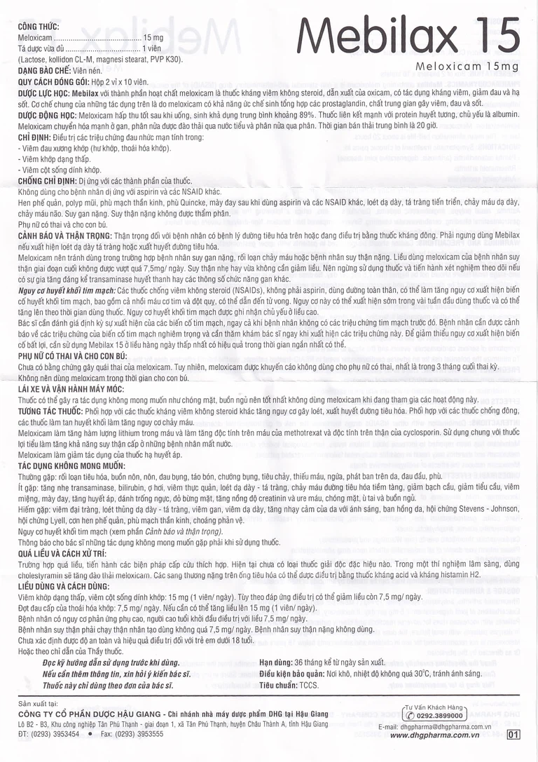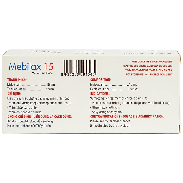 Mebilax với thành phần hoạt chất meloxicam là thuốc kháng viêm không steroid, dẫn xuất của oxicam, có tác dụng kháng viêm, giảm đau và hạ sốt. Cơ chế chung của những tác dụng trên là do meloxicam có khả năng ức chế sinh tổng hợp các prostaglandin, chất trung gian gây viêm, đau và sốt.