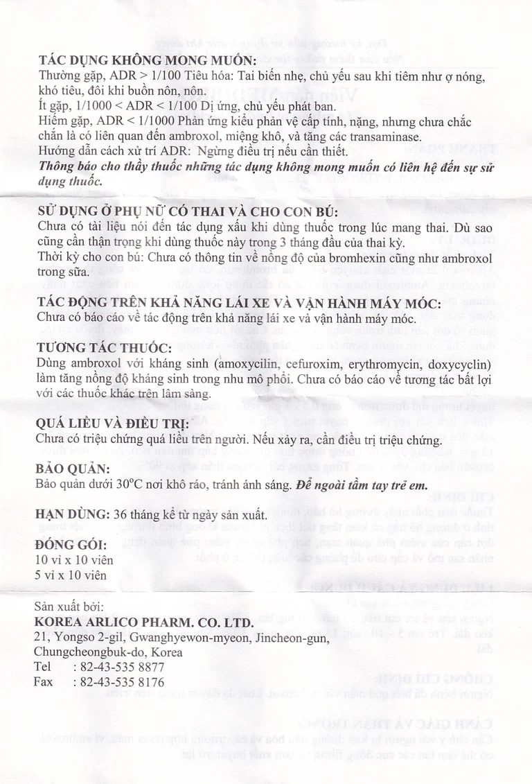 - Phản ứng kiểu phản vệ cấp tính, nặng, nhưng chưa chắc chắn là có liên quan đến ambroxol, miệng khô, và tăng các transaminase.