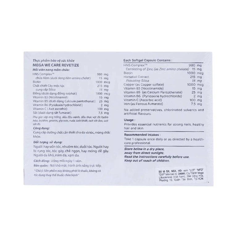 Viên uống đẹp da, ngăn rụng tóc Mega We Care Revetize giúp bạn cung cấp dưỡng chất cho mái tóc, hỗ trợ giảm rụng tóc đồng thời kích thích mọc tóc giúp bạn có mái tóc chắc khỏe và bóng đẹp, nhờ các thành phần: Biotin giảm rụng tóc, kích thích mọc tóc và Vitamin nhóm B và khoáng chất bổ sung dưỡng chất giúp tóc khỏe đẹp từ gốc đến ngọn, móng chắc khỏe và da mịn màng.