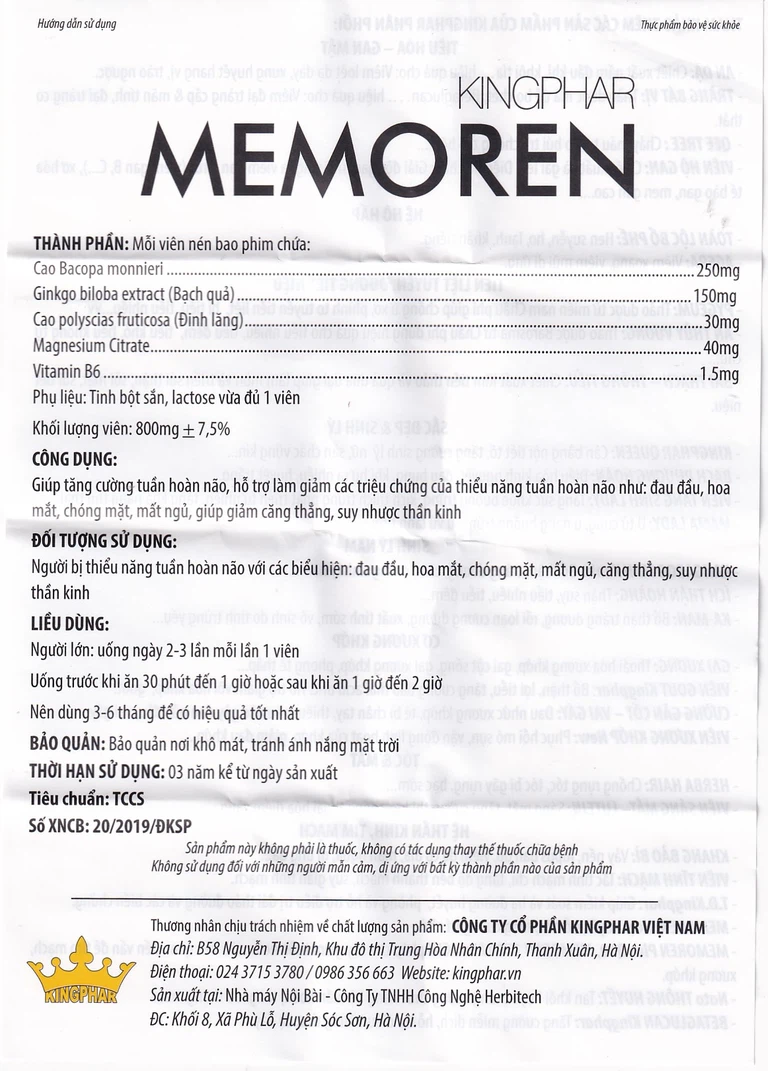 Memoren Kingphar giúp tăng cường tuần hoàn não, hỗ trợ làm giảm các triệu chứng của thiểu năng tuần hoàn não như: Đau đầu, hoa mắt, chóng mặt, mất ngủ, giúp giảm căng thẳng, suy nhược thần kinh.