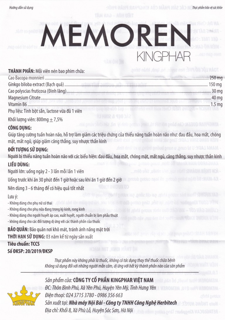 Memoren Kingphar giúp tăng cường tuần hoàn não, hỗ trợ làm giảm các triệu chứng của thiểu năng tuần hoàn não như: Đau đầu, hoa mắt, chóng mặt, mất ngủ, giúp giảm căng thẳng, suy nhược thần kinh.