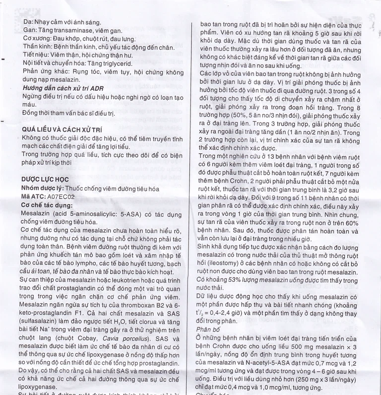 Nông độ ổn định trung bình trong huyết tương của 5-ASA và N-acetyl-5-ASA ‘đạt mức 0,7 mcg và 1.2 mcg/ mL tương ứng liều 500mg x 3 lần/ngày.