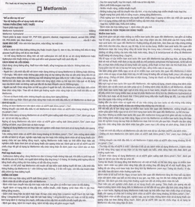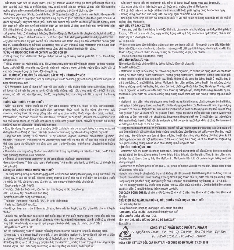 Metformin là sản phẩm của Công ty cổ phần Dược phẩm TV.Pharm, thành phần chính là Metformin HCl. Thuốc dùng để điều trị bệnh đái tháo đường không phụ thuộc insulin (type II), hoặc dùng Metformin đồng thời với một sulfonylure khi chế độ ăn và khi dùng Metformin hoặc Sulfonylure đơn thuần không có hiệu quả kiểm soát glucose huyết một cách đầy đủ.