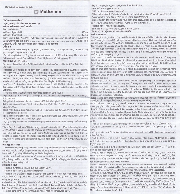 - Trẻ em: Mặc dù hiếm gặp. Liều dùng metformin cho trẻ từ 10 – 16 tuổi là 500 mg một lần, ngày 2 lần vào bữa ăn sáng và tối. Cứ mỗi tuần, tăng thêm 1 viên. Liều tối đa là 2g/ngày chia làm 2 hoặc 3 lần.