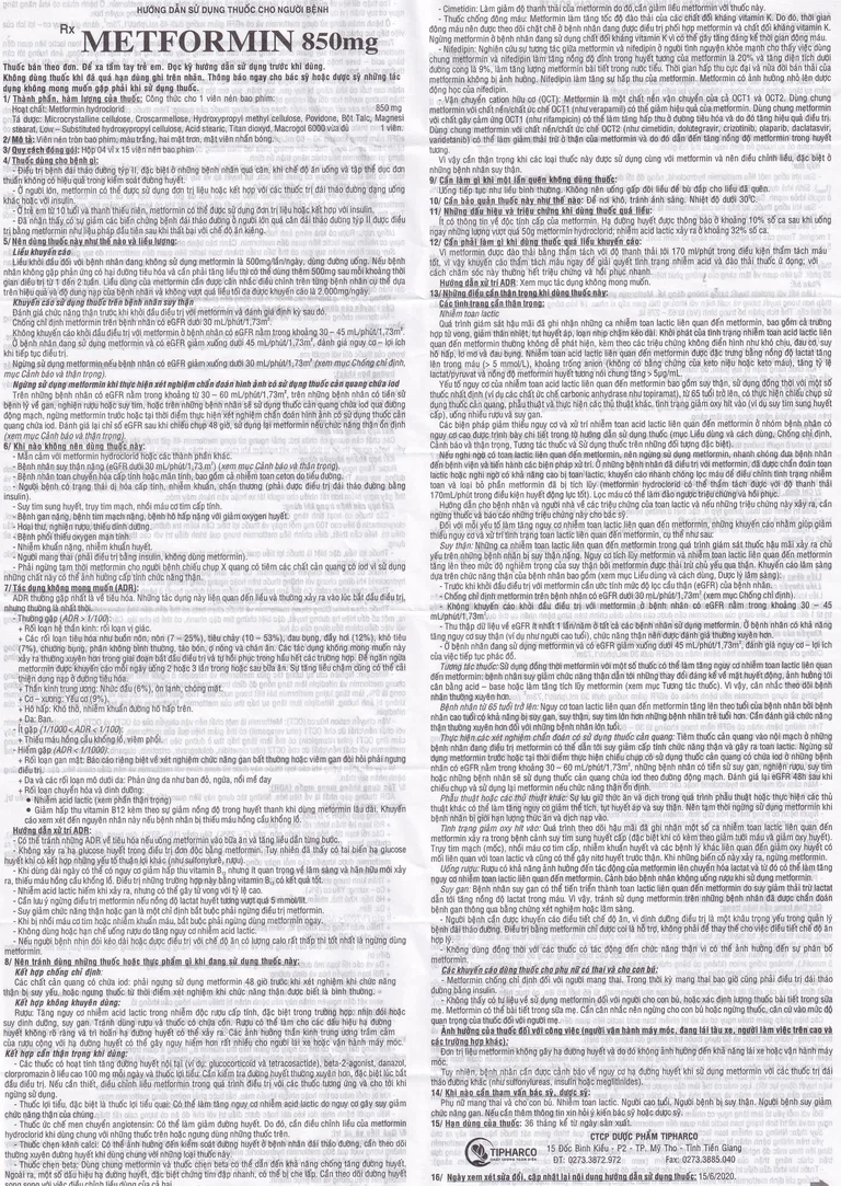 Metformin 850 mg của công ty CPDP Tipharco, có thành phần là Metformin hydroclorid (hàm lượng 850 mg).Thuốc được dùng đơn trị liệu trong điều trị đái tháo đường không phụ thuộc insulin (tuýp II) khi không thể điều trị tăng glucose huyết bằng chế độ ăn đơn thuần. Ngoài ra, có thể dùng metformin đồng thời với một sulfonylurea khi chế độ ăn và khi dùng metformin hoặc sulfonylurea đơn thuần không có hiệu quả kiểm soát glucose huyết một cách đầy đủ hơn.