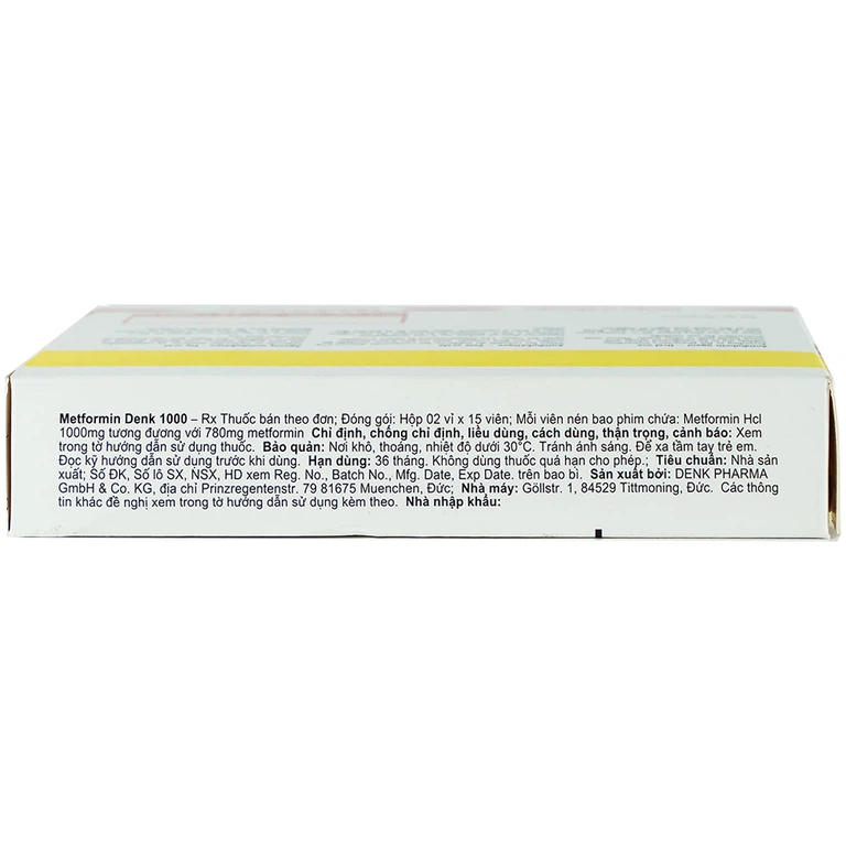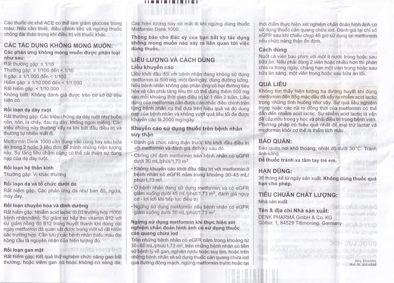 Rối loạn dạ dày ruột: Các triệu chứng dạ dày ruột như buồn nôn, nôn, tiêu chảy , đau dạ dày, không ngon miệng. Các triệu chứng này thường xảy ra khi bắt đầu điều trị và thường tự nhiên mất đi. Metformin Denk 1000 cần dùng vào cùng hay sau bữa ăn trong 2 hoặc 3 liều đơn để tránh những hiện tượng này. Sự tăng liều chậm cũng có thể cải thiện sự dung nạp của dạ dày ruột.