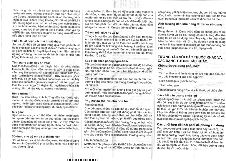 Dùng ở bệnh nhân lớn tuổi:Vì tiềm năng giảm chức năng thận ở người già, nên chỉnh liều Metformin Denk 1000 dựa trên chức năng thận. Vì lý do này cần thiết đánh giá thường xuyên chức năng thận.