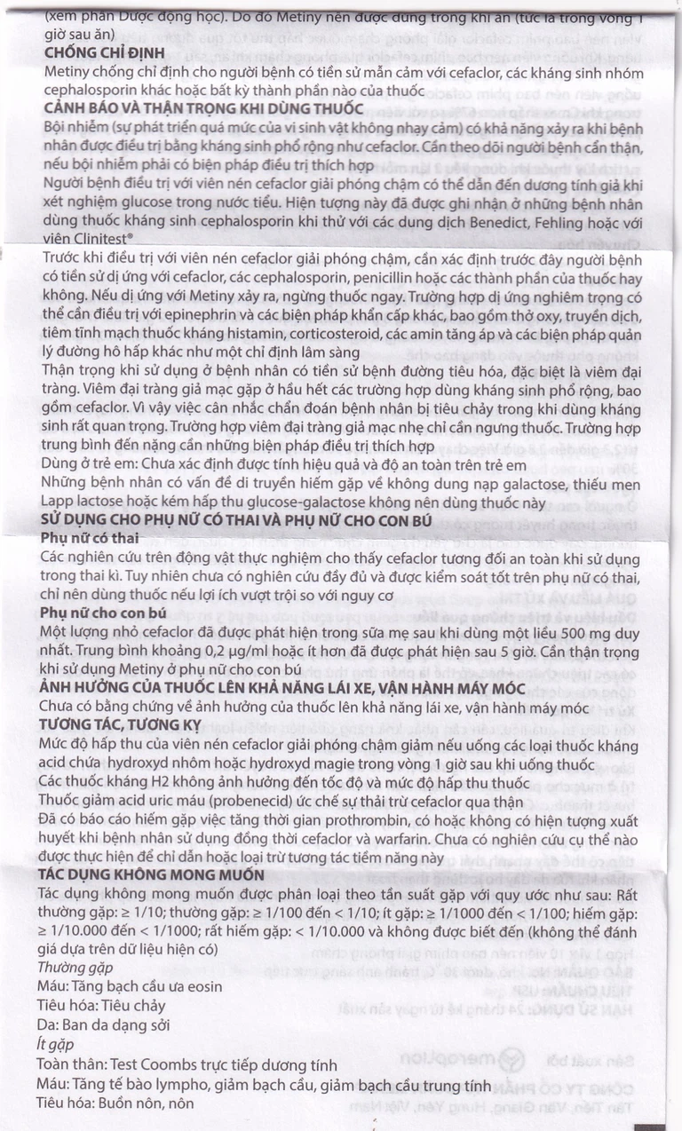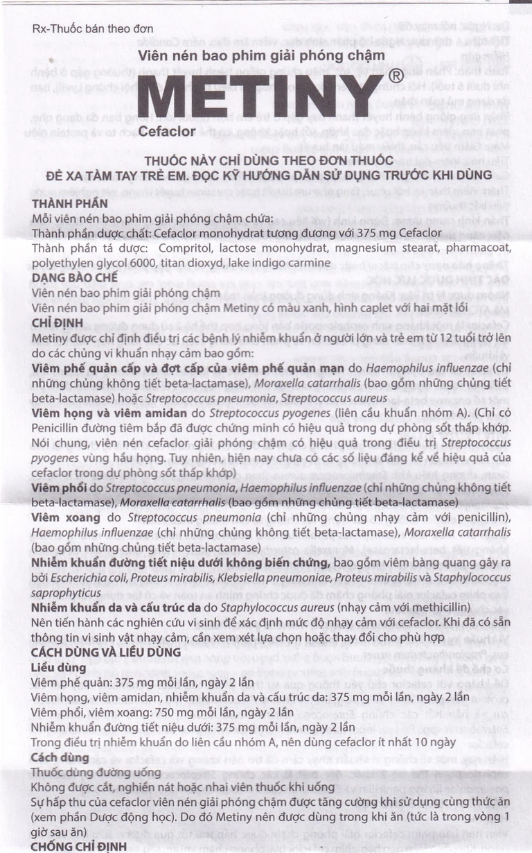 Không được cắt, nghiền nát hoặc nhai viên thuốc khi uống. Sự hấp thu của cefaclor viên nén giải phóng chậm được tăng cường khi sử dụng cùng thức ăn (xem phần dược động học). Do đó Metiny nên được dùng trong khi ăn (tức là trong vòng 1 giờ sau ăn).