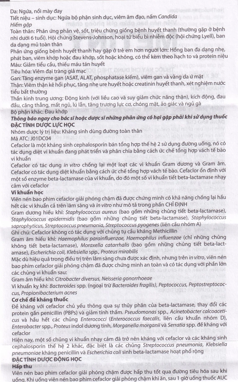 Viên nén bao phim cefaclor giải phóng chậm đã được chứng minh có khả năng chống lại hầu hết các vi khuẩn cả trên lâm sàng và in vitro như mô tả trong phần chỉ định.