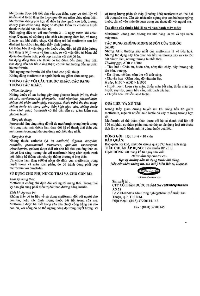 Một số người bệnh có thể dùng liều 850mg (1 viên)/lần x 3 lần/ngày (vào các bữa ăn).