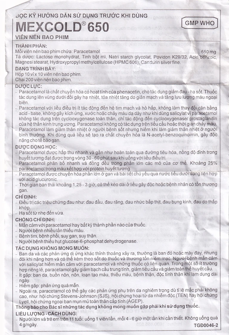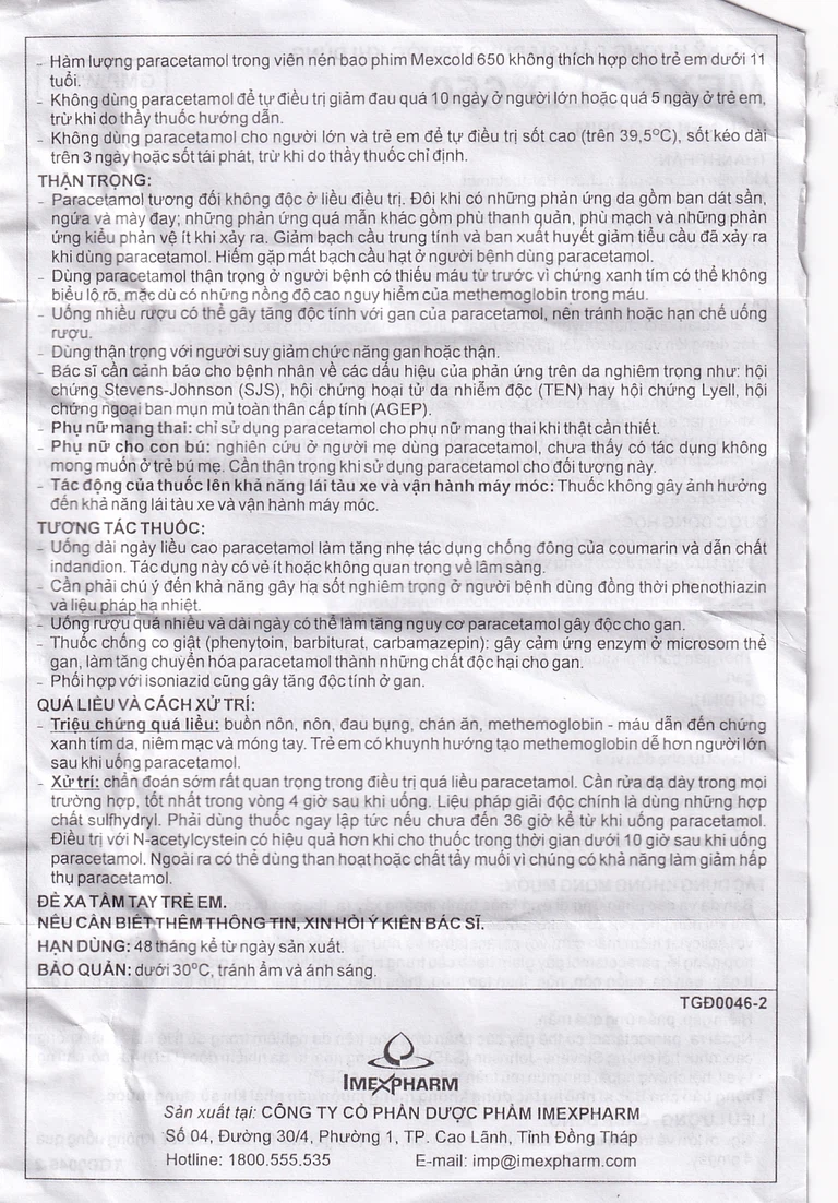 Hàm lượng paracetamol trong viên nén bao phim MEXCOLD 650 không thích hợp cho trẻ em dưới 11 tuổi.