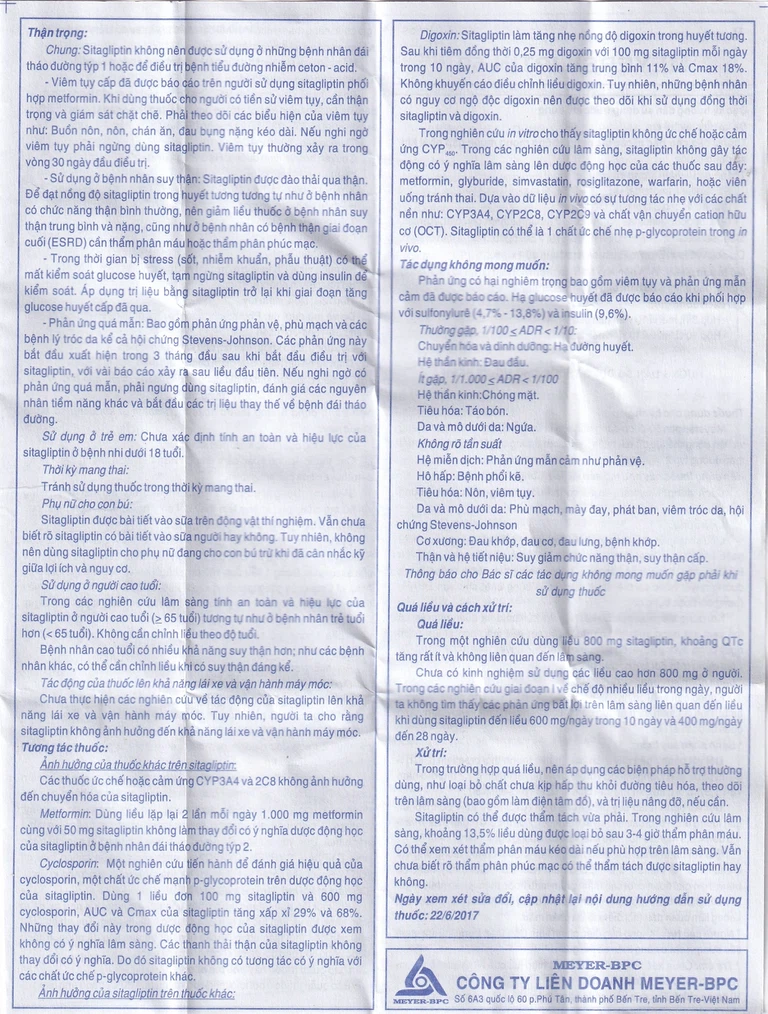 Sử dụng ở bệnh nhân suy thận: Sitagliptin được đào thải qua thận. Để đạt nồng độ sitagliptin trong huyết tương tương tự như ở bệnh nhân có chức năng thận bình thường, nên giảm liều thuốc ở bệnh nhân suy thận trung bình và nặng, cũng như ở bệnh nhân có bệnh thận giai đoạn cuối (ESRD) cần thẩm phân máu hoặc thẩm phân phúc mạc.