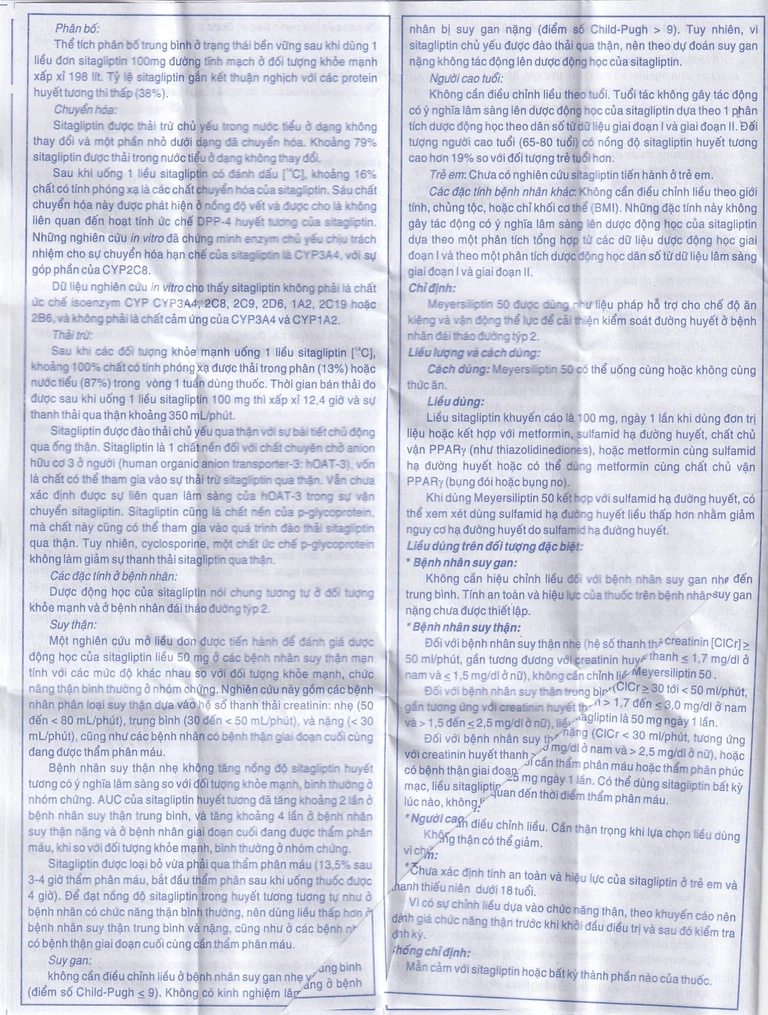 Đối với bệnh nhân suy thận nhẹ (hệ số thanh thải creatinin [CIcr] > 50 ml/phút, gần tương đương với creatinin huyết thanh < 1,7 mg/dl ở nam và < 1,5 mg/dl ở nữ): Không cần chỉnh liều Meyersiliptin 50.