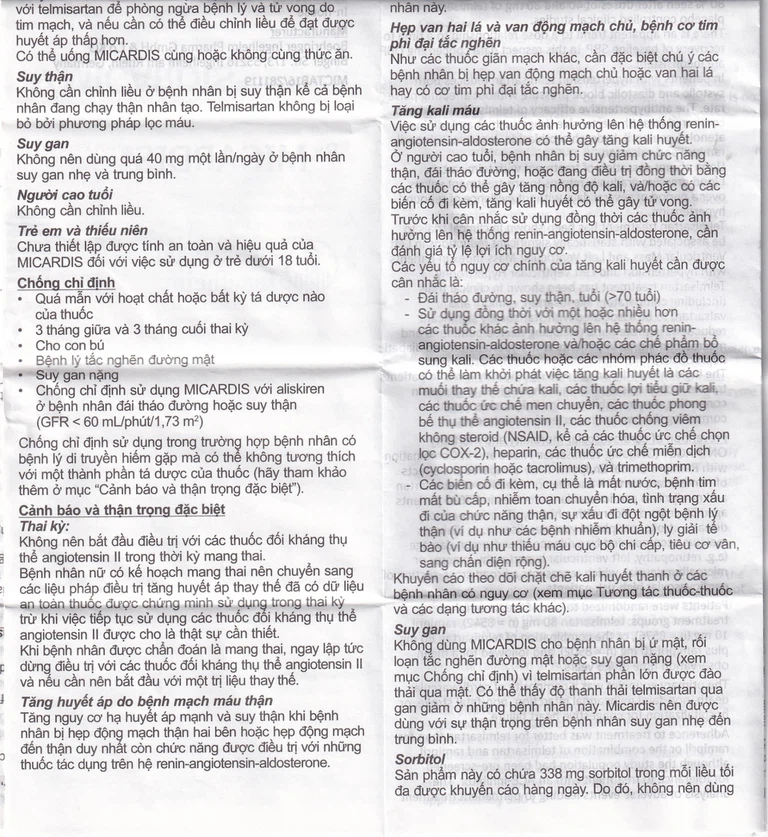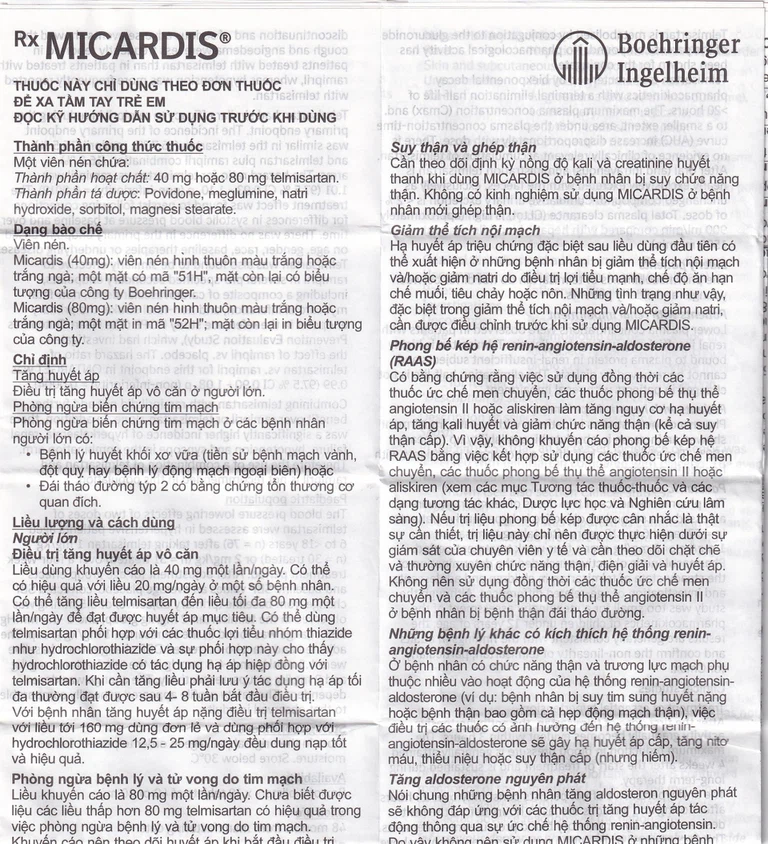 Thuốc Micardis 40mg được sản xuất bởi Boehringer Ingelheim Pharma GmbH Co. KG, với thành phần chính Telmisartan, là thuốc dùng để điều trị tăng huyết áp vô căn ở người lớn và phòng ngừa biến chứng tim mạch trong một số trường hợp.