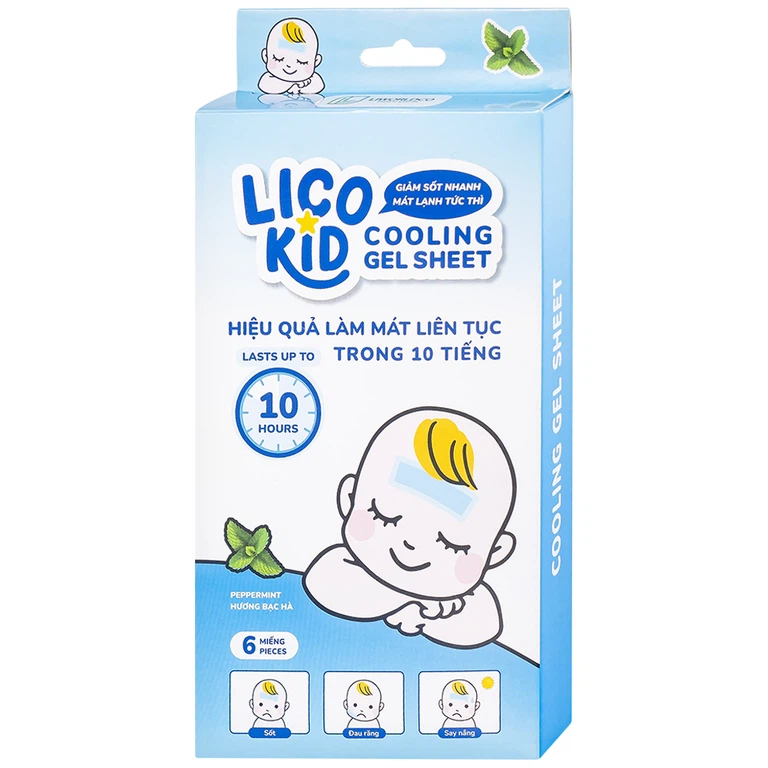 Miếng dán hạ sốt Licokid hương bạc hà trong thành phần có Hydrogel thân nước làm mát tự nhiên, giúp hạ nhiệt, hạ sốt, giảm đau, say nắng theo cơ chế hấp thụ nhiệt từ cơ thể khuếch tán ra bên ngoài. Miếng dán có hiệu quả làm mát liên tục trong 10 tiếng.