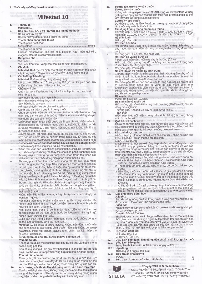 Chảy máu: Bệnh nhân phải được cảnh báo về việc chảy máu âm đạo kéo dài có thể nặng hơn (trung bình 12 ngày hoặc nhiều hơn khi sử dụng Mifestad 10). Tuy nhiên, hiện tượng này không hẳn là thai được tống ra hoàn toàn.