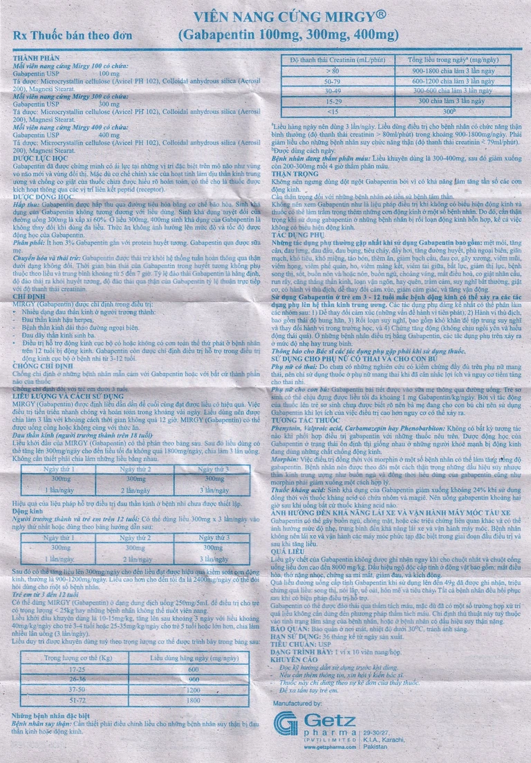 Có thể dùng Mirgy (gabapentin) ở dạng dung dịch uống 250 mg/5 ml để điều trị cho trẻ có trọng lượng < 25 kg hay những bệnh nhân không thể nuốt viên nang.