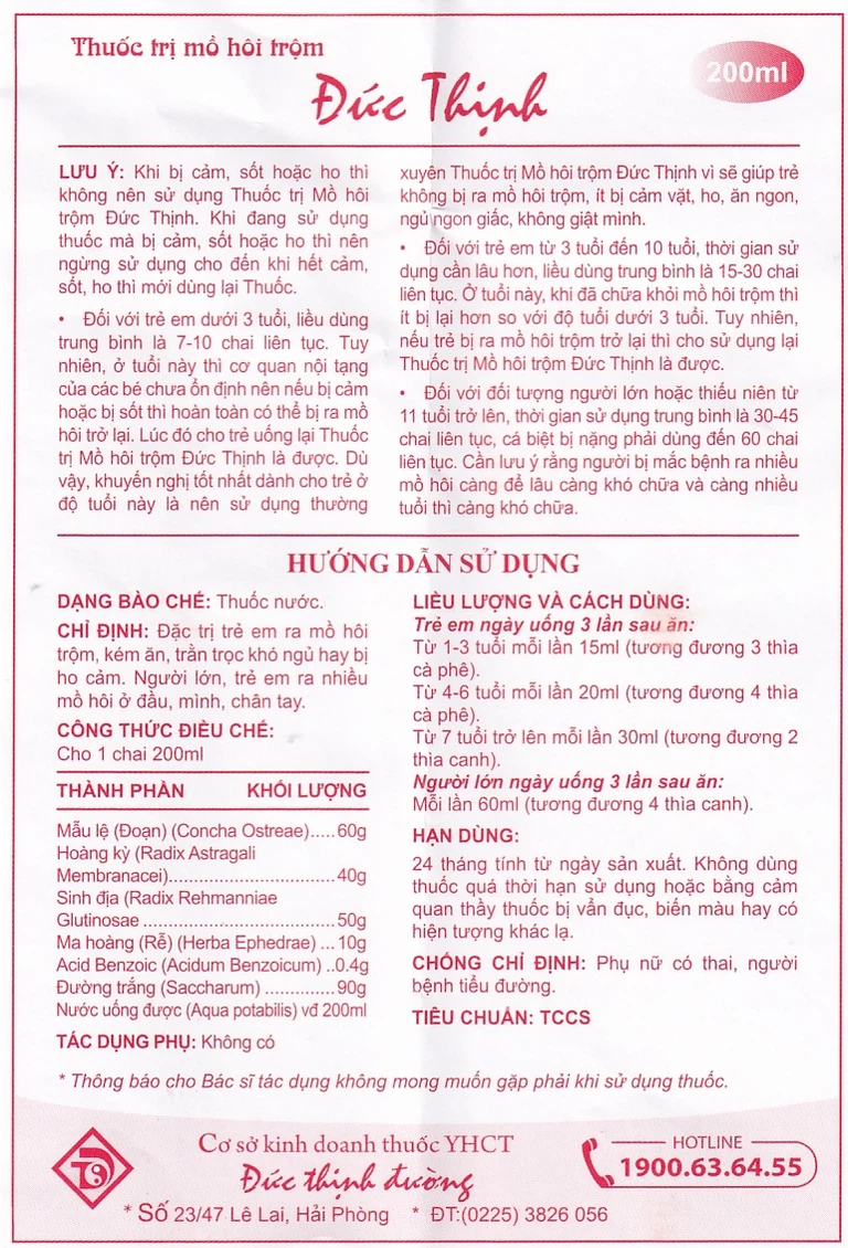 Thuốc trị mồ hôi trộm Đức Thịnh đặc trị ra mồ hôi trộm, kém ăn, khó ngủ (125ml)