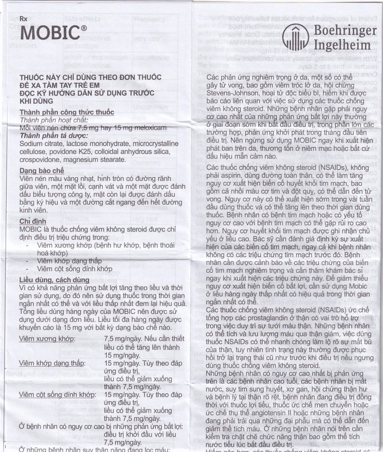 Mobic là thuốc chống viêm không steroid có tác dụng, chống viêm, giảm đau và hạ sốt. Cơ chế tác dụng chung cho những tác dụng trên do meloxicam ức chế sinh tổng hợp các prostaglandin những chất trung gian gây viêm.