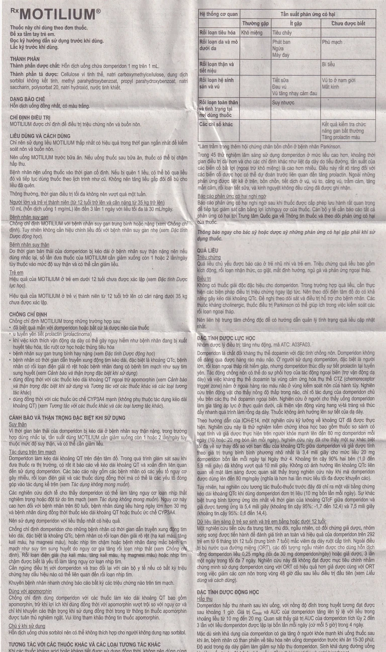 Motiliumchỉ nên sử dụng liều thấp nhất có hiệu quả trong thời gian ngắn nhất để kiểm soát nôn và buồn nôn.