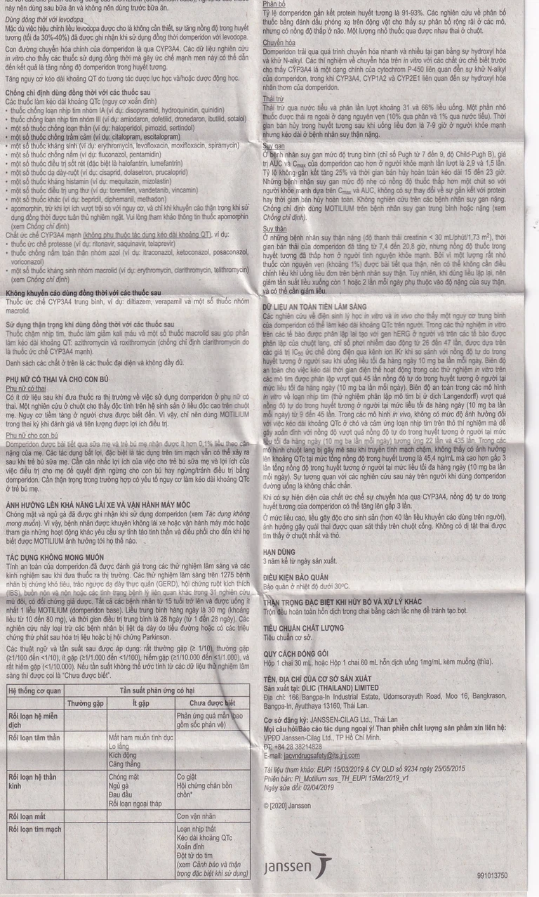 Tất cả các bệnh nhân từ 15 tuổi trở lên và được uống ít nhất 1 liều Motilium (domperidon base). Liều trung bình hằng ngày là 30mg (khoảng liều từ 10 đến 80mg), và thời gian điều trị trung bình là 28 ngày (từ 1 đến 28 ngày). Các nghiên cứu này loại trừ các bệnh nhân bị liệt dạ dày do tiểu đường hoặc có các triệu chứng thứ phát sau hóa trị liệu hoặc bị hội chứng Parkinson.