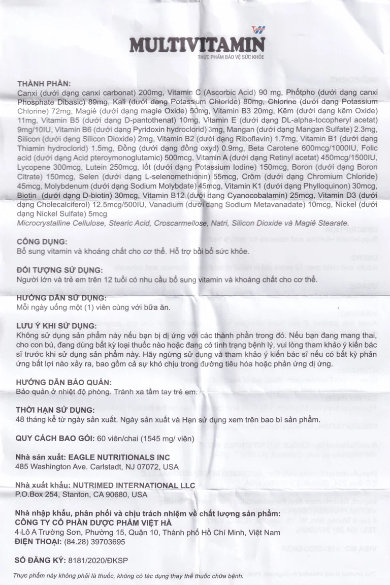 Multivitamin Nutrimed được nhập khẩu chính hãng từ Mỹ và được sản xuất bởi Eagle Nutritionals Inc. Eagle Nutritionals là nhà sản xuất hợp đồng dịch vụ đầy đủ các chất bổ sung thảo dược, vitamin, khoáng chất và thực phẩm chức năng. Eagle Nutritionals duy trì các tiêu chuẩn chất lượng và an toàn, mang đến một sản phẩm được người tiêu dùng tìm kiếm và tin tưởng. Các sản phẩm của Eagle Nutritionals có cơ sở sản xuất đáp ứng tiêu chuẩn GMP theo FDA Hoa Kỳ, đạt chất lượng theo tiêu chuẩn NSF do WHO chứng nhận.