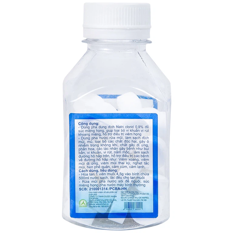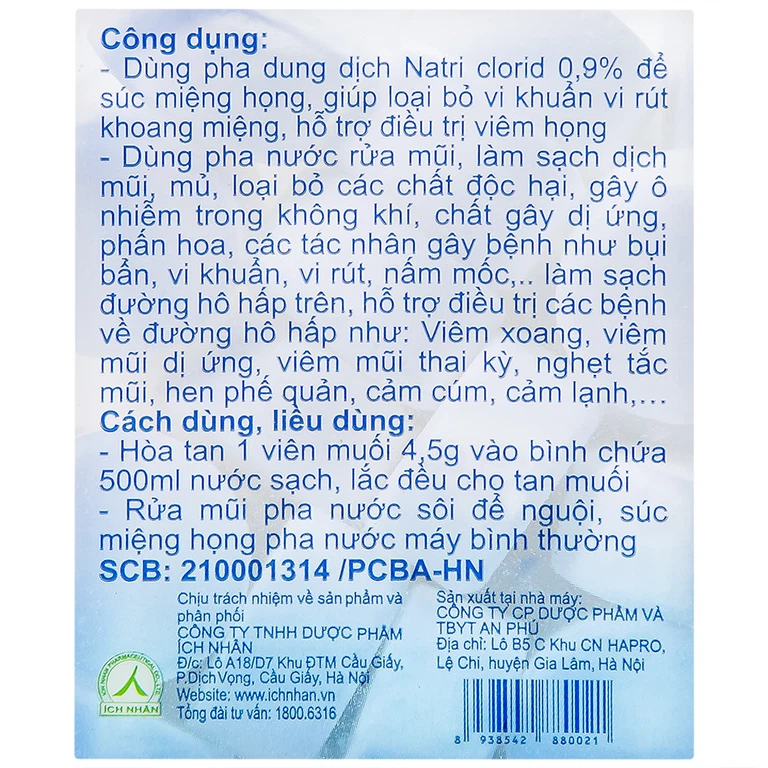 Muối y tế Ích Nhân 50 viên 4.5G là muối Natri 0,9% (nước muối sinh lý) dạng viên rất tiện lợi, dùng pha dung dịch rửa mũi, súc họng, làm sạch dịch mũi, mủ…