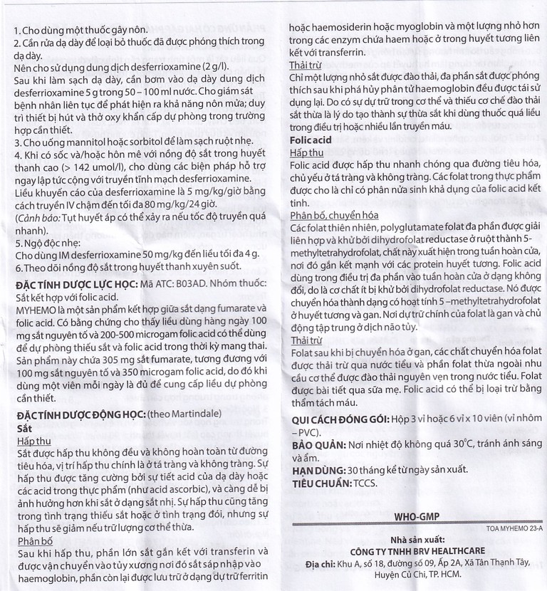 Myhemo là một sản phẩm kết hợp giữa sắt dạng fumarate và folic acid. Có bằng chứng cho thấy liều dùng hàng ngày 100mg sắt nguyên tố và 200-500 microgam folic acid có thể dùng để dự phòng thiếu sắt và folic acid trong thời kỳ mang thai.