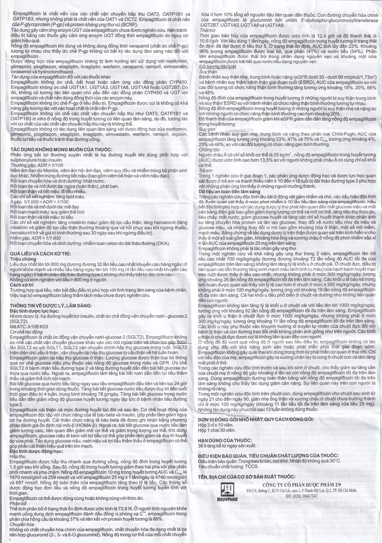 Empagliflozin được hấp thu nhanh qua đường uống, nồng độ đĩnh trong huyết tương 1,5 giờ sau khi uống. Sau đó, nồng độ trong huyết tương giảm theo hai pha với pha phân phối nhanh và pha chậm. Nồng độ empagliflozin 10 mg trong huyết tương AUC và Cmax là 1870 nmol/giờ/I và 259 nmol/l và với empagliflozin 25 mg x 1 lần/ngày là 4740 nmol/giờ/I và 687 nmol/l. Nồng độ toàn thân của empagliflozin tăng theo tỷ lệ liều. Các thông số dược động học đơn liều và nồng độ empagliflozin trong huyết tương tuyến tính với thời gian.
