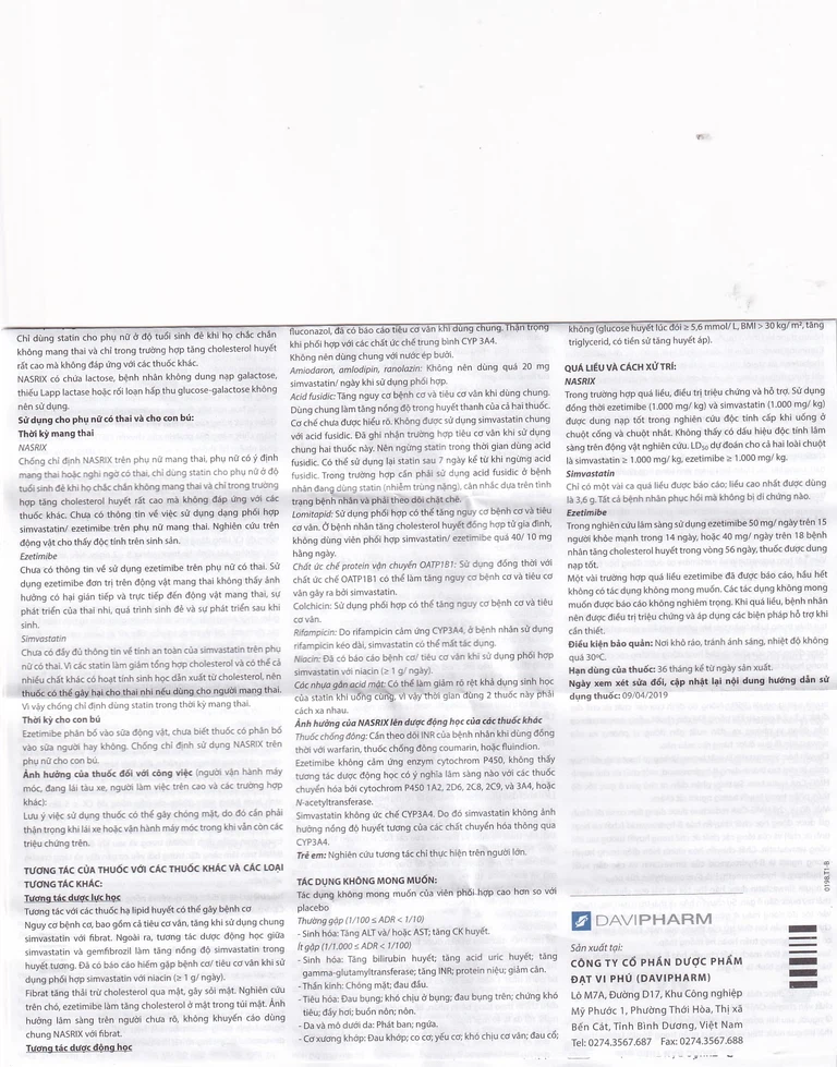Viên Nasrix là dạng viên kết hợp chứa simvastatin 20mg/ezetimibe 10mg, được sử dụng để thay thế viên simvastatin 20mg và ezetimibe 10mg riêng lẻ hoặc được dùng để phối hợp thêm ezetimibe khi điều trị bằng simvastatin 20mg không đạt được mục tiêu điều trị. Nasrix không thích hợp với chỉ định điều trị với liều lượng khác.