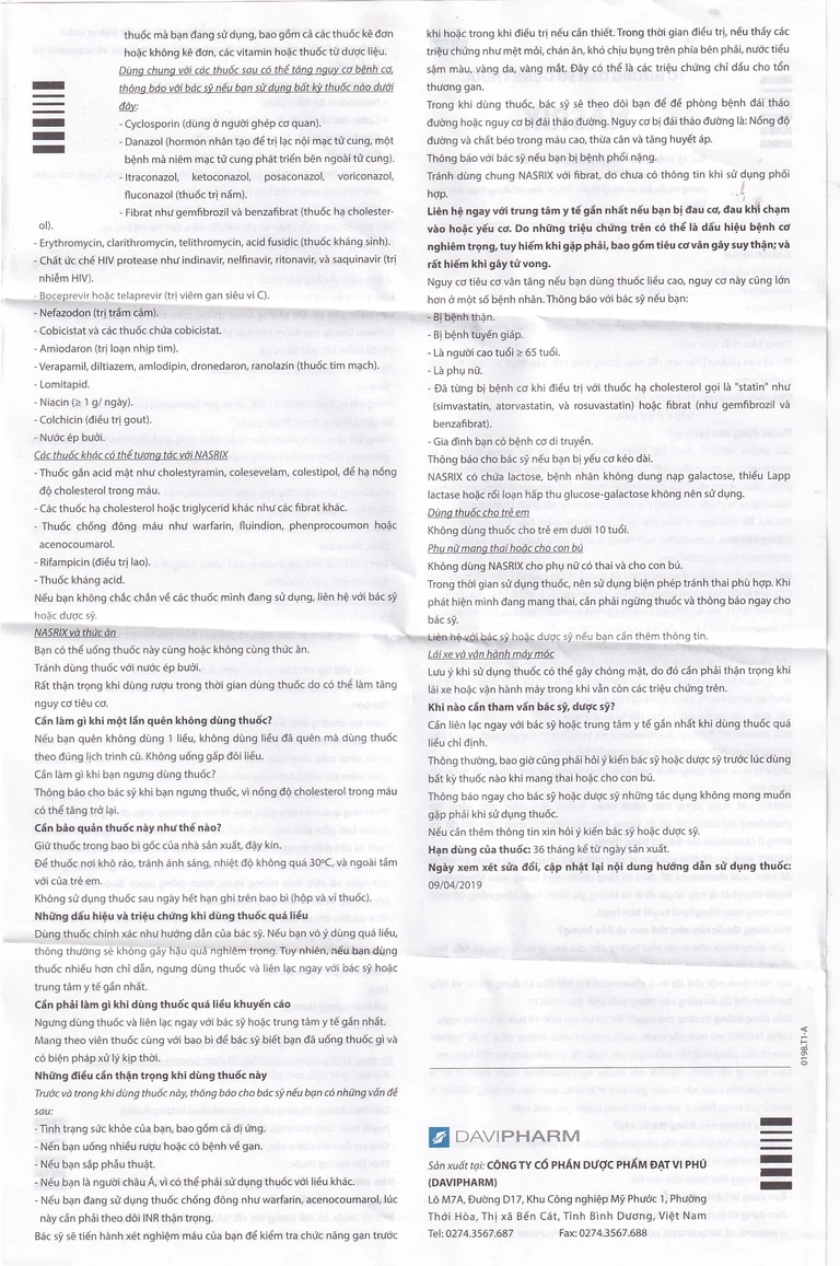 Nếu triệu chứng được giải quyết và nồng độ CK trở về mức bình thường, cân nhắc sử dụng lại Nasrix hoặc chuyển đổi qua thuốc chứa statin khác ở liều thấp nhất có hiệu quả và cần theo dõi chặt chẽ.