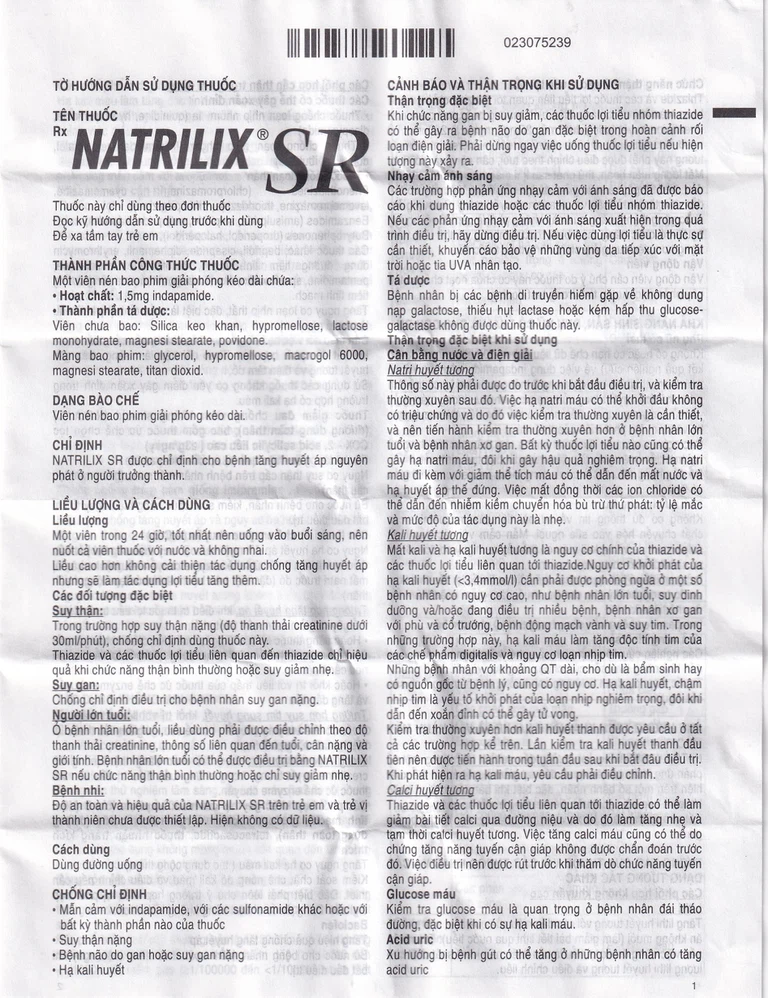 Ở bệnh nhân lớn tuổi, liều dùng phải được điều chỉnh theo độ thanh thải creatinine, thông số liên quan đến tuổi, cân nặng và giới tính. Bệnh nhân lớn tuổi có thể được điều trị bằng Natrilix Sr nếu chức năng thận bình thường hoặc chỉ suy giảm nhẹ.
