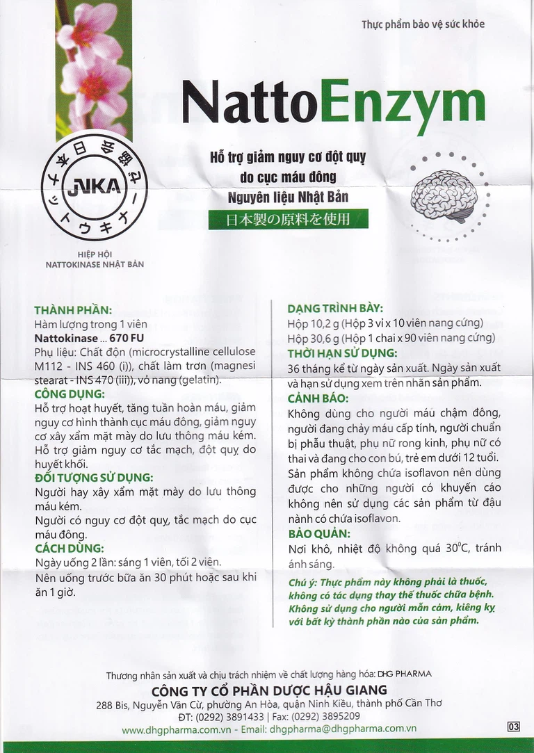 NattoEnzym hỗ trợ hoạt huyết, tăng tuần hoàn máu, giảm nguy cơ hình thành cục máu đông, giảm nguy cơ xây xẩm mặt mày do lưu thông máu kém. Hỗ trợ giảm nguy cơ tắc mạch, đột quỵ do huyết khối.