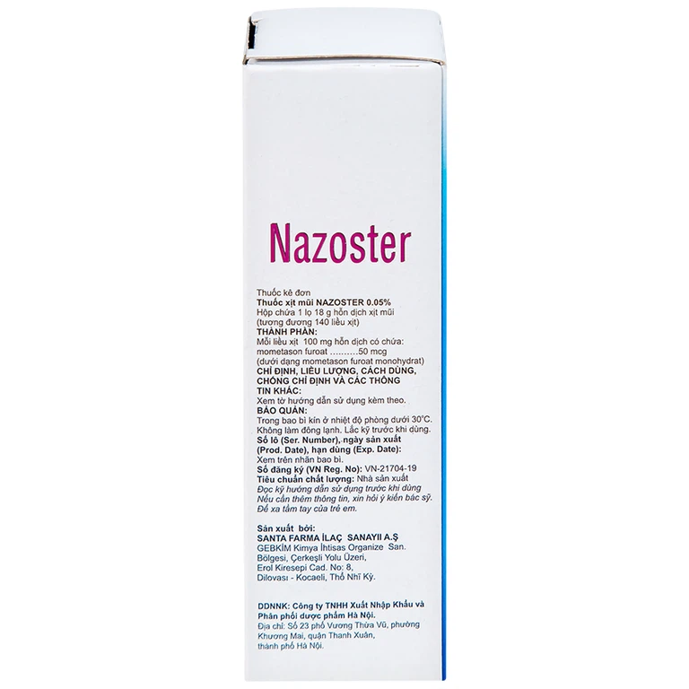 - Thuốc xịt mũi Nazoster 0,05% được chỉ định để sử dụng ở người lớn và trẻ em từ 3 tuổi trở lên để điều trị các triệu chứng viêm mũi dị ứng theo mùa hoặc viêm mũi quanh năm.