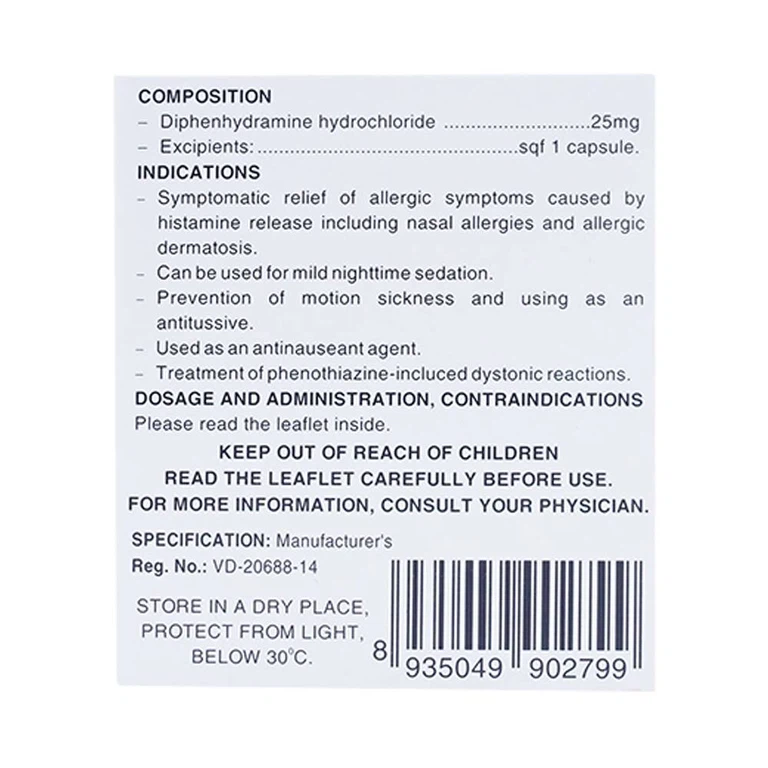 Diphenhydramine hấp thu tốt từ đường tiêu hóa sau khi uống. Nồng độ đỉnh đạt được khoảng 1–4 giờ và sinh khả dụng của thuốc khoảng 61%. Thời gian tác dụng của thuốc khoảng 4–6 giờ.