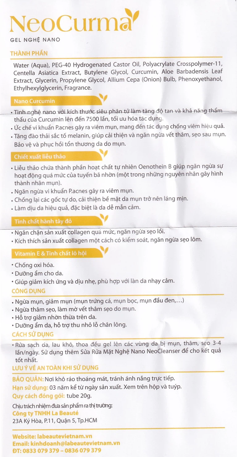 Gel nghệ nano NeoCurma là kháng sinh tự nhiên có kích thước siêu nhỏ nên dễ dàng thấm sâu qua da để thu nhỏ nhân mụn, giảm viêm và phát huy được công dụng làm mờ sẹo, phục hồi làn da nhanh chóng. Tinh chất hành tây đỏ vừa giàu vitamin và khoáng chất giúp ngăn ngừa hình thành sẹo lõm sau mụn, loại bỏ vùng da xạm, đem lại một làn da láng mịn và đều màu. Vitamin E và lô hội (nha đam) có công dụng dưỡng ẩm hiệu quả, chống oxy hóa. Nguyên liệu sản phẩm hoàn toàn thiên nhiên, được nhập khẩu từ châu Âu.