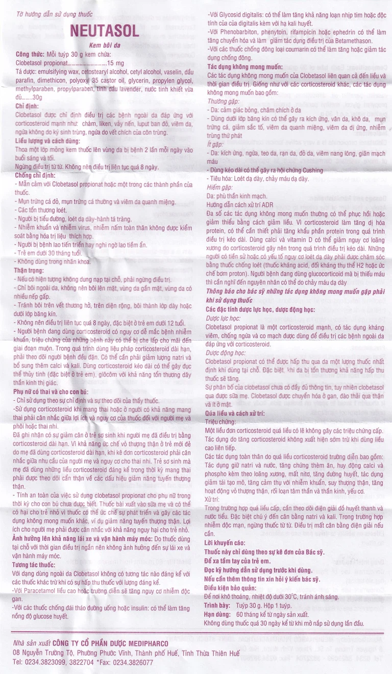 Thuốc Neutasol Cream Medipharco 30g được chỉ định dùng trong các trường hợp điều trị các bệnh ngoài da đáp ứng với corticosteroid mạnh như chàm, liken, vảy nến , lupus ban đỏ, viêm da, ngứa không do ký sinh trùng, ngứa do vết chích của côn trùng.