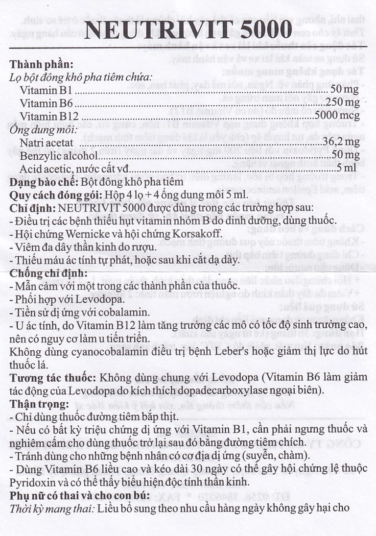 Neutrivit 5000 là sản phẩm của Công ty cổ phần Dược và Trang thiết bị Y tế Bình Định (Bidiphar) – Việt Nam, thành phần chính là vitamin B1, vitamin B6, vitamin B12. Neutrivit 5000 dùng để điều trị viêm thần kinh, viêm đa thần kinh, viêm đa thần kinh do rượu mãn tính, viêm thần kinh thị giác, hậu nhãn cầu do thuốc hay độc chất, đau thần kinh tọa, đau do phong thấp, đau thần kinh cổ cánh tay, suy nhược cơ thể, thiếu vitamin nhóm B.