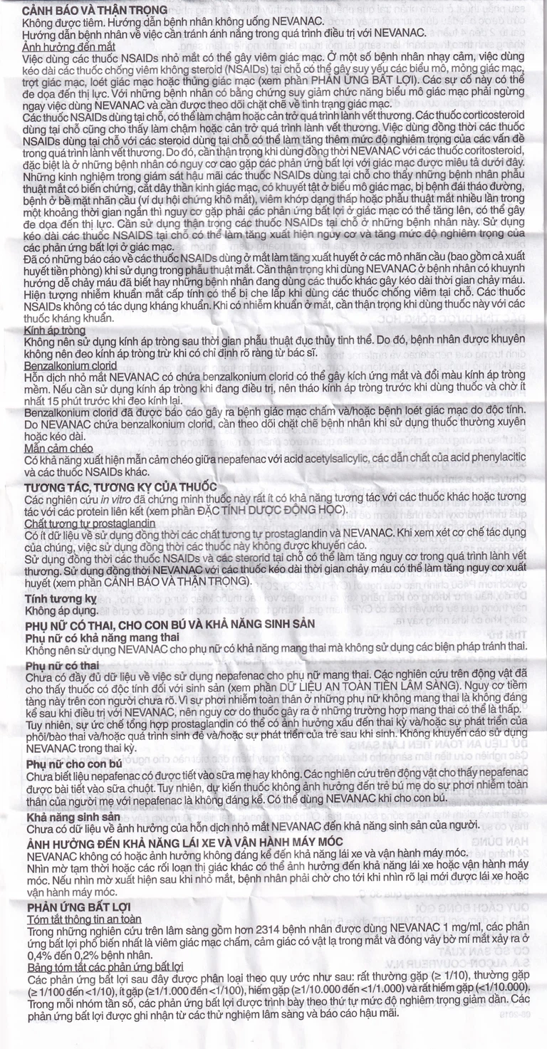 Hỗn dịch nhỏ mắt Nevanac có chứa benzalkonium clorid có thể gây kích ứng mắt và đổi màu kính áp tròng mềm. Mặt khác, trong thời gian sau phẫu thuật đục thủy tinh thể không khuyến cáo bệnh nhân đeo kính áp tròng. Do đó, bệnh nhân cần được cảnh báo không đeo kính áp tròng trong khi điều trị với hỗn dịch nhỏ mắt Nevanac. Benzalkonium clorid là chất bảo quản thường được sử dụng trong các thuốc tra mắt, đã được báo cáo gây ra bệnh giác mạc chấm hoặc bệnh loét giác mạc do độc tính. Cần theo dõi chặt chẽ bệnh nhân khi sử dụng hỗn dịch nhỏ mắt Nevanac thường xuyên hoặc kéo dài.