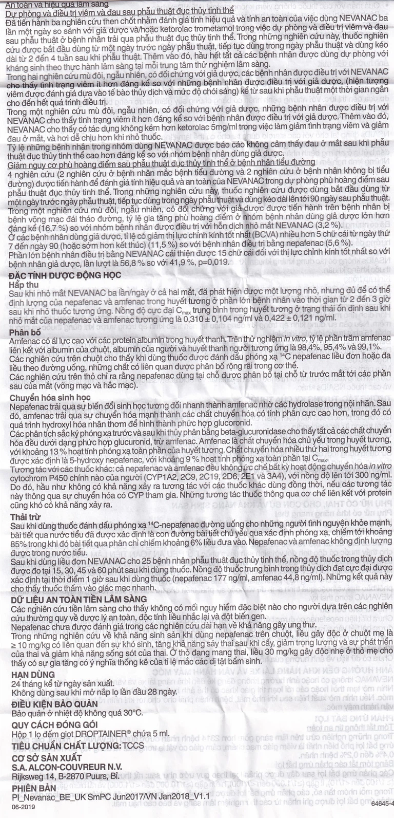 Sau khi nhỏ mắt hỗn dịch nhỏ mắt Nevanac ba lần/ngày ở cả hai mắt, đã phát hiện được nepafenac và amphenac trong huyết tương với lượng nhỏ, nhưng đủ để có thể định lượng được ở phần lớn bệnh nhân vào thời gian từ 2 đến 3 giờ sau khi nhỏ thuốc tương ứng. Nồng độ cực đại Cmax trung bình ở trạng thái ổn định sau khi nhỏ mắt của nepafenac và amfenac tương ứng là 0,310 ± 0,104ng/ml và 0,422 ± 0,121ng/ml.