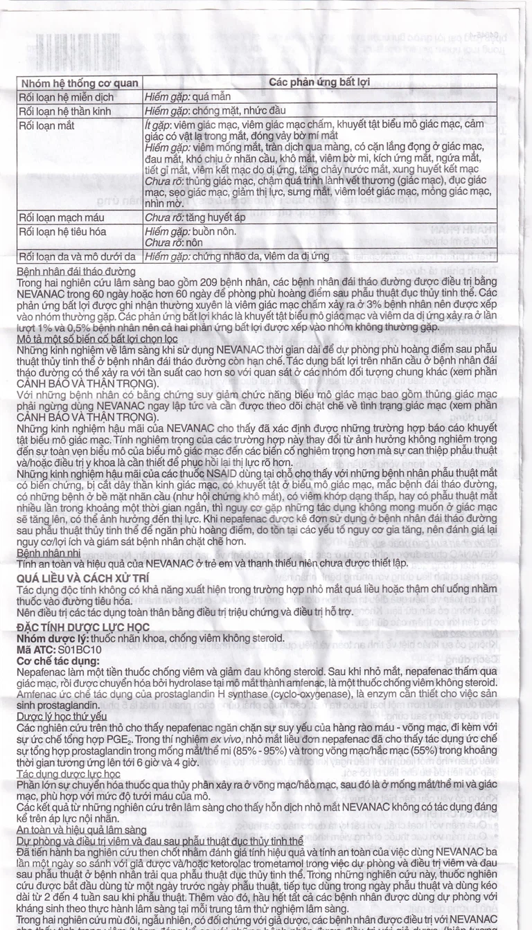 Các tác dụng không mong muốn sau đã được báo cáo trong các thử nghiệm lâm sàng với hỗn dịch nhỏ mắt Nevanac và được phân loại theo quy ước như sau: Rất phổ biến (≥ 1/10), phổ biến (≥ 1/100 đến <1/10), không phổ biến (≥ 1/1.000 đến <1/100), hiếm gặp (≥ 1/10.000 đến <1/1.000) và rất hiếm gặp (< 1/10.000).