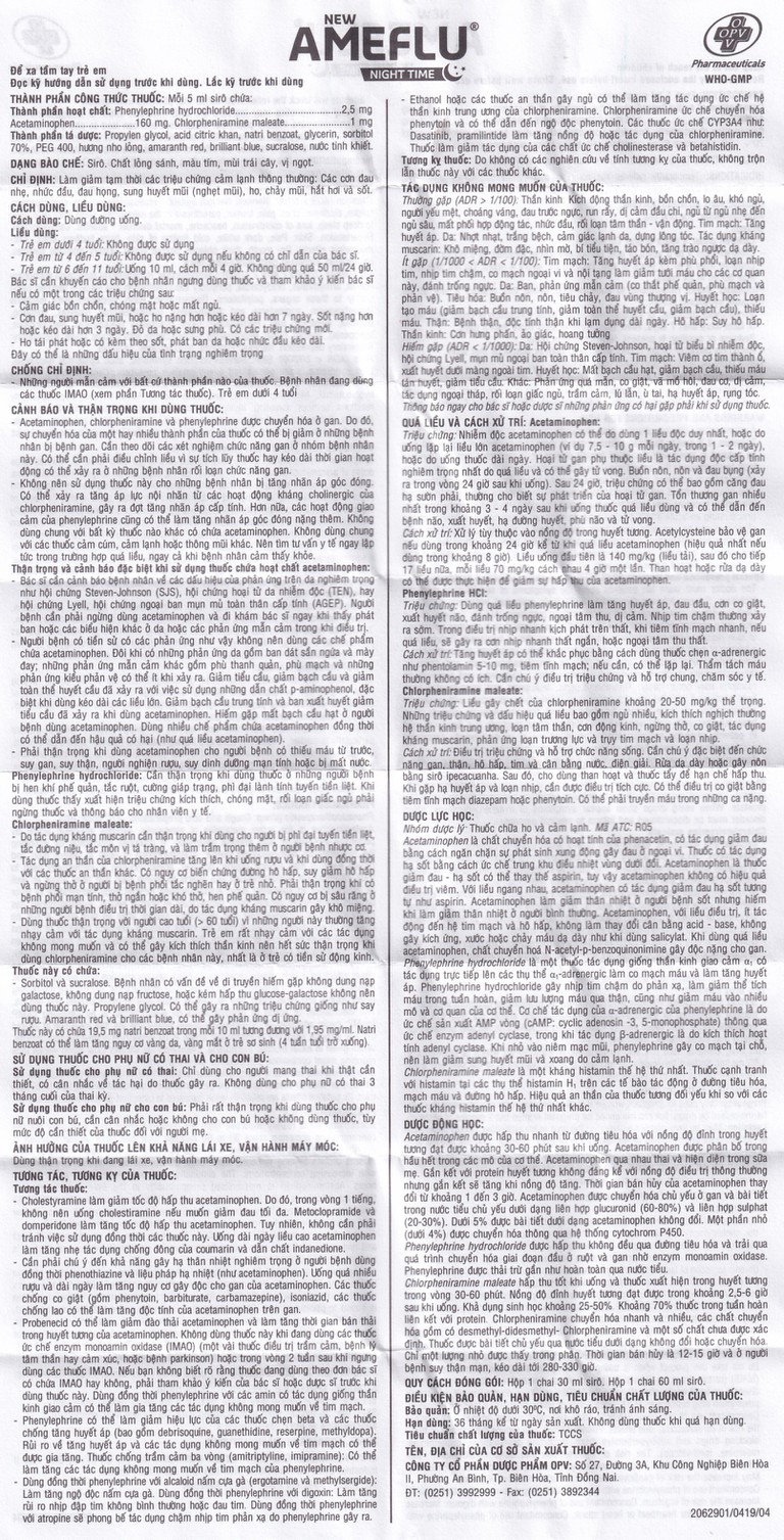 Thuốc New Ameflu Night Time đóng gói dạng chai sirô, chất lỏng sánh, màu tím, mùi trái cây, vị ngọt. Thuốc phối hợp ba hoạt chất acetaminophen, phenylephrin HCI, clorpheniramin maleat được dùng để giảm triệu chứng cảm lạnh thông thường ở trẻ từ 6 – 11 tuổi.