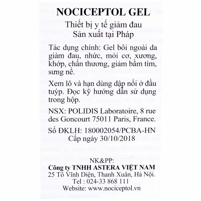 Gel Nociceptol là sản phẩm giảm đau tự nhiên có tốc độ bán chạy nhất tại châu Âu vì tính hiệu quả và an toàn. Tại Việt nam, Nociceptol đã sớm được các bác sĩ đón nhận và tin dùng, đặc biệt là các bác sĩ chuyên khoa đầu ngành cơ xương khớp, Y học thể thao, phục hồi chức năng, ngoại chấn thương… tại các bệnh viện lớn. Sản phẩm với thành phần gồm nhiều loại tinh dầu tự nhiên, không chất bảo quản, thích hợp dùng cho cả người lớn và trẻ em trên 7 tuổi.