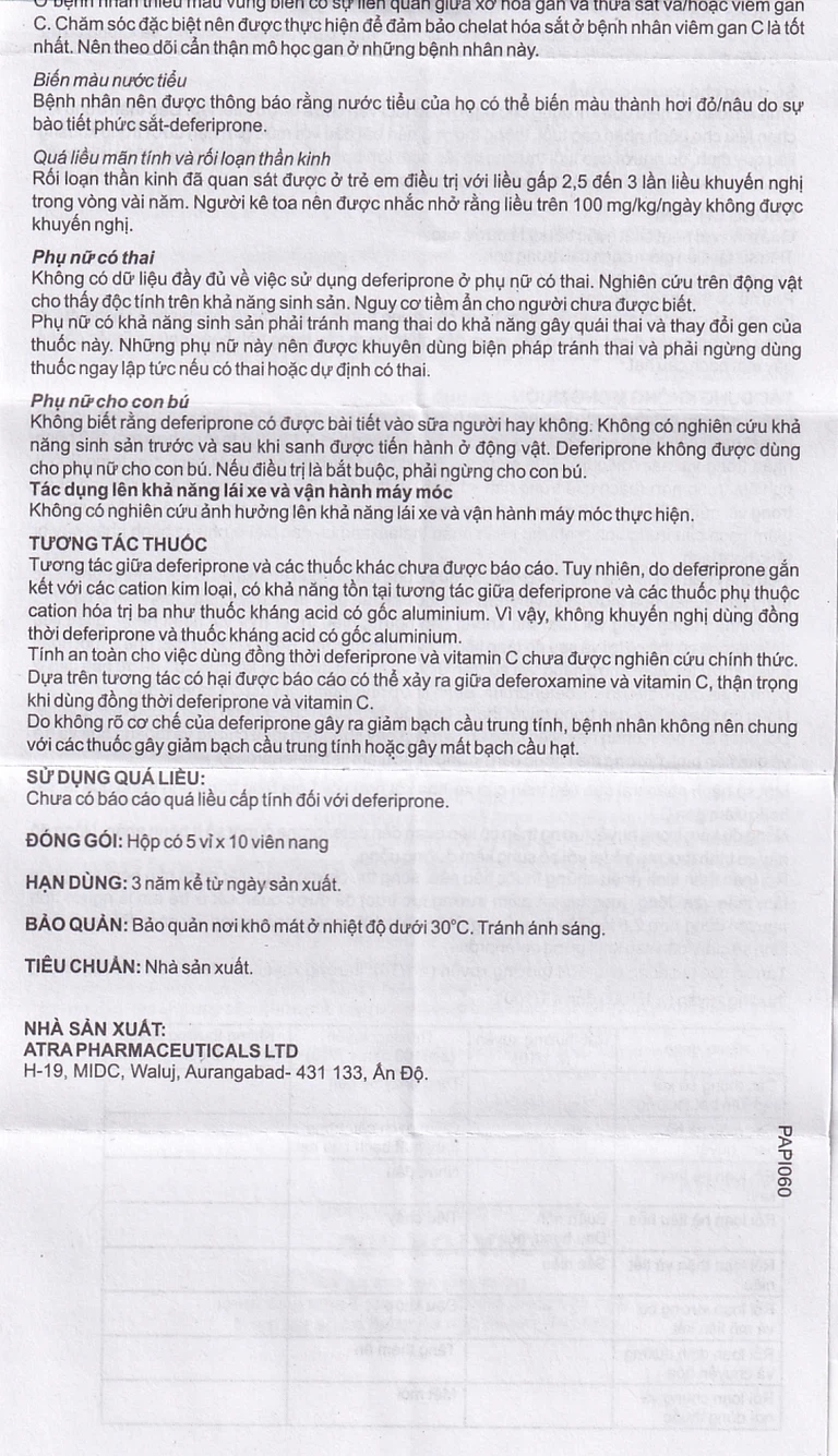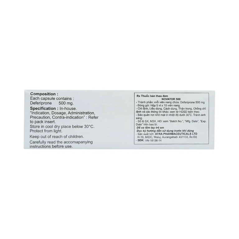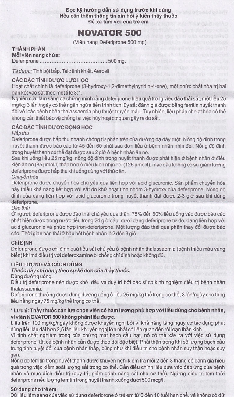 Thuốc Novator 500 do Công ty ATRA PHARMACEUTICALS LTD., Ấn Độ sản xuất dưới dạng viên nén chứa deferiprone 500 mg, được chỉ định trong trường hợp quá liều sắt chủ yếu ở bệnh nhân thiếu máu beta thalassaemia (bệnh thiếu máu vùng biển) khi mà điều trị với deferoxamine bị chống chỉ định hoặc không đủ.