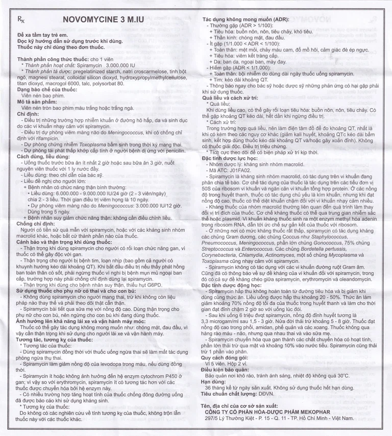 Thuốc Novomycine 3 M.IUchống chỉ định trong các trường hợp: Người có tiền sử quá mẫn với spiramycin, hoặc với các kháng sinh nhóm macrolid khác, hoặc bất cứ thành phần nào của thuốc.