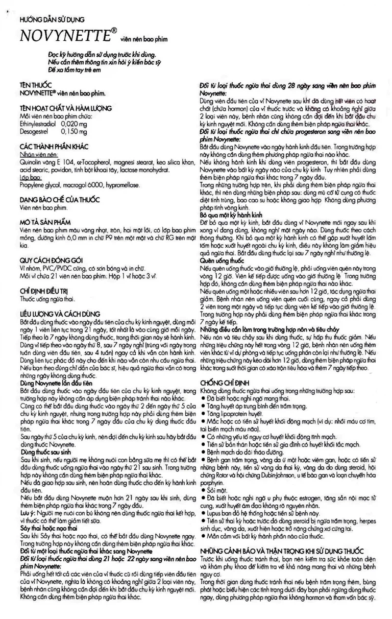 Novynette được sản xuất bởi Gedeon Richter Plc (Hungary), thành phần chính là ethinylestradiol và desogestrel, là thuốc uống dùng để ngừa thai. Mỗi viên nén bao phim chứa ethinylestradiol 0,020mg, desogestrel 0,150mg. Mỗi vỉ chứa 21 viên nén bao phim.