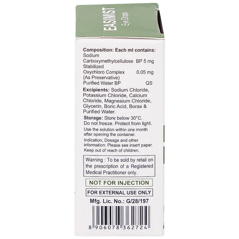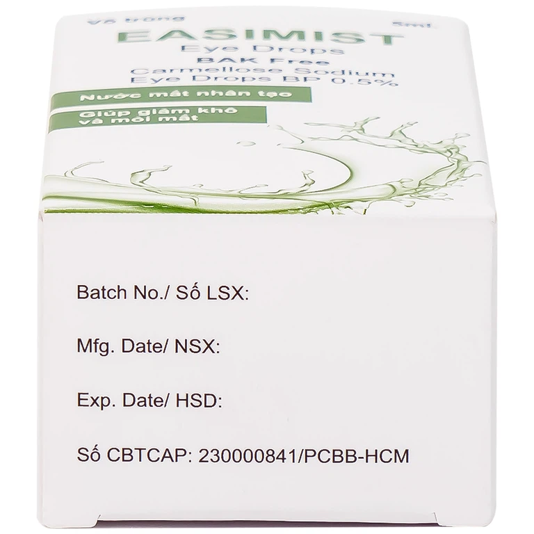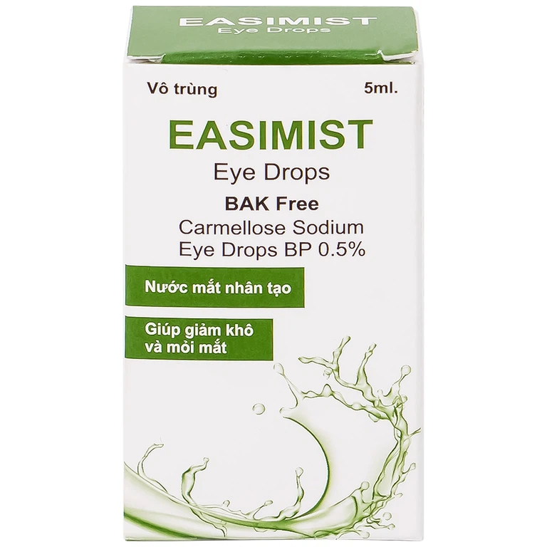 Nước mắt nhân tạo Easimist Eye Drops là chất bôi trơn sảng khoái cho đôi mắt khô và mệt mỏi được phát triển để bù nước và có tác dụng làm dịu mắt. Nó giúp giảm bớt sự khó chịu và kích ứng ở mắt do tiếp xúc lâu với màn hình máy tính, bụi, khói và ánh sáng mặt trời hoặc khô mắt do tuổi tác.