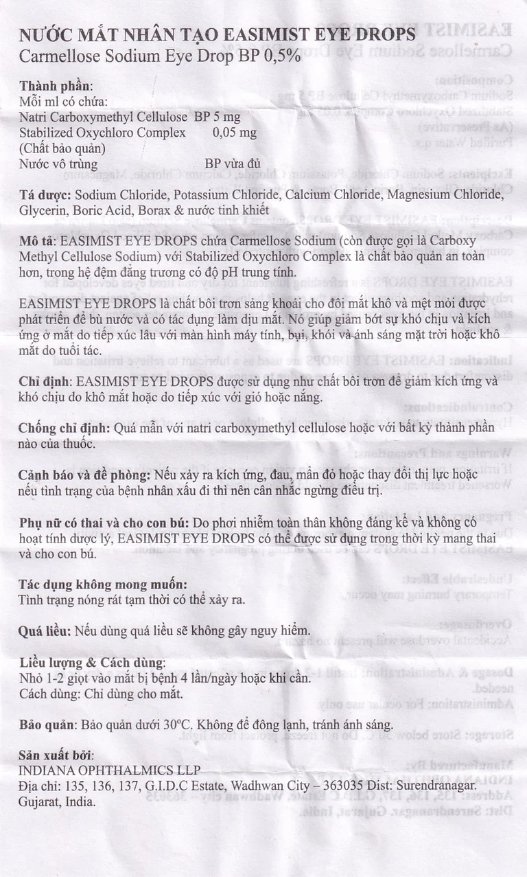 Nước mắt nhân tạo Easimist Eye Drops Indiana Ophthalmics giúp giảm khô và mỏi mắt (5ml)