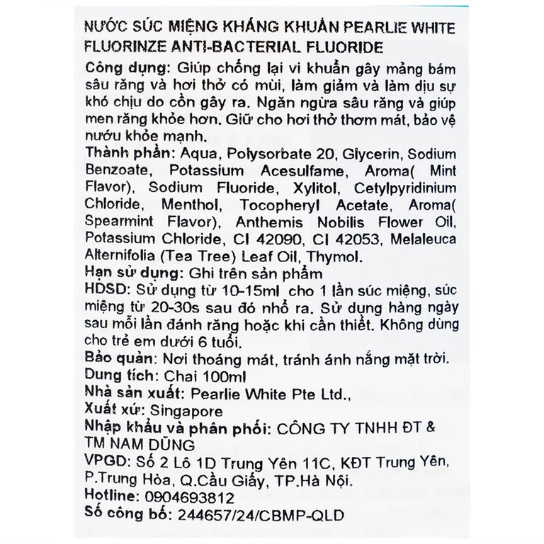 Thành phần của Pearlie White Fluorinze Anti-bacterial Fluoride 100ml
